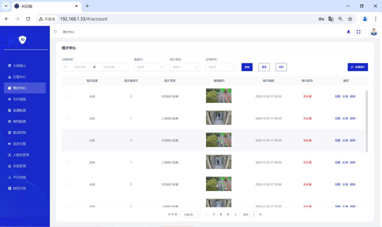 统计中心对统计类的场景识别的信息进行展示,包括人数统计、人流统计、车流统计、车位统计、人脸识别等五种场景。信息包括统计时间、统计位置、统计图片等信息。