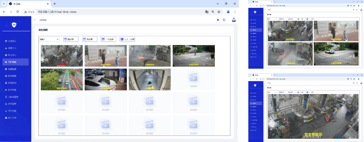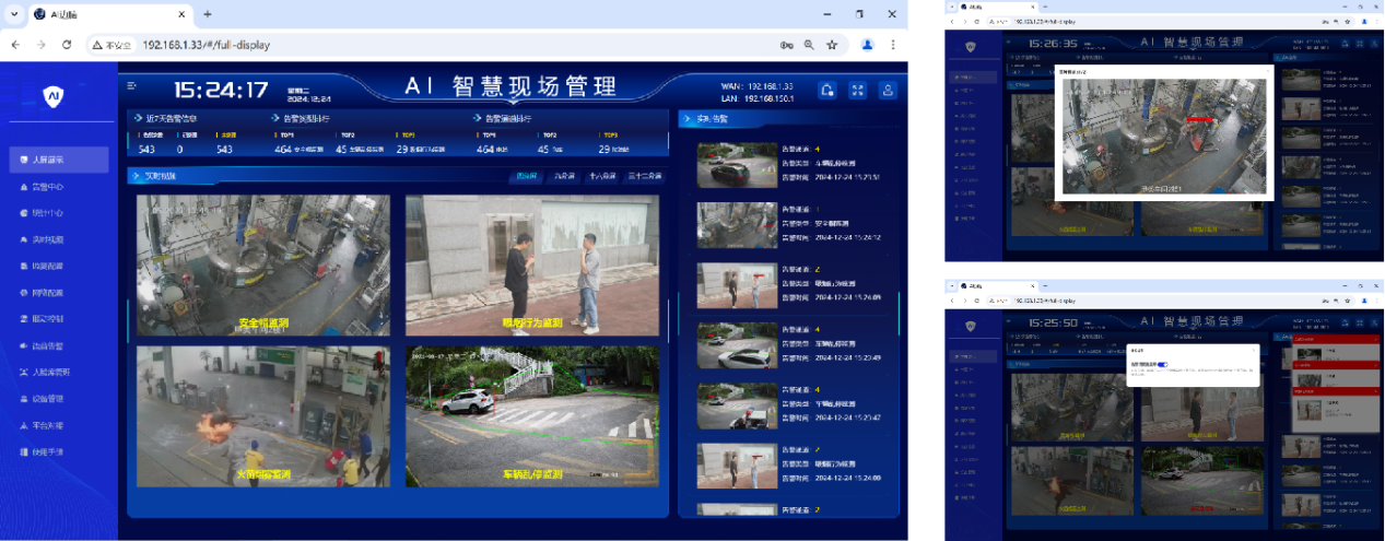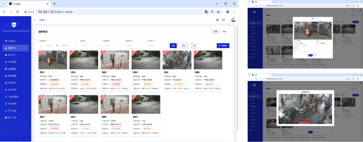 大屏展示对告警统计、实时画面及告警信息进行总览展示。让用户能够一屏查看相关告警监测信息。同时支持告警弹窗及告警语音的提示,也可以告警信息进行大图预览。