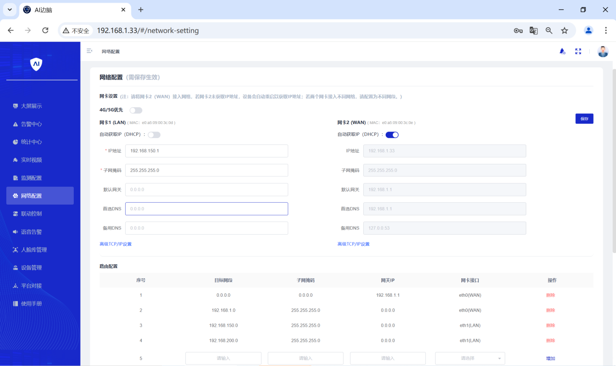 网络配置支持对边脑的WAN口和LAN口进行配置,支持自动搜索网络情况,支持多层网络路由配置;支持4G/5G网络。