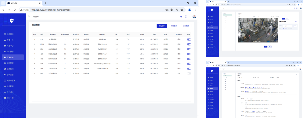 监测配置提供对监测的通道进行配置,包括算法、视频流、监测区域及监测参数。支持实时视频流及本地视频流;支持通道调参,支持个性化参数配置。