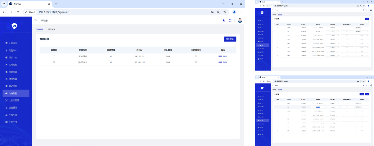 语音告警可对接IP音柱,将IP音柱进行添加、编辑及删除;对各通道的告警语音及告警音箱进行配置,并可自定义配置告警语音文字;支持同一个通道多音箱语音告警。
