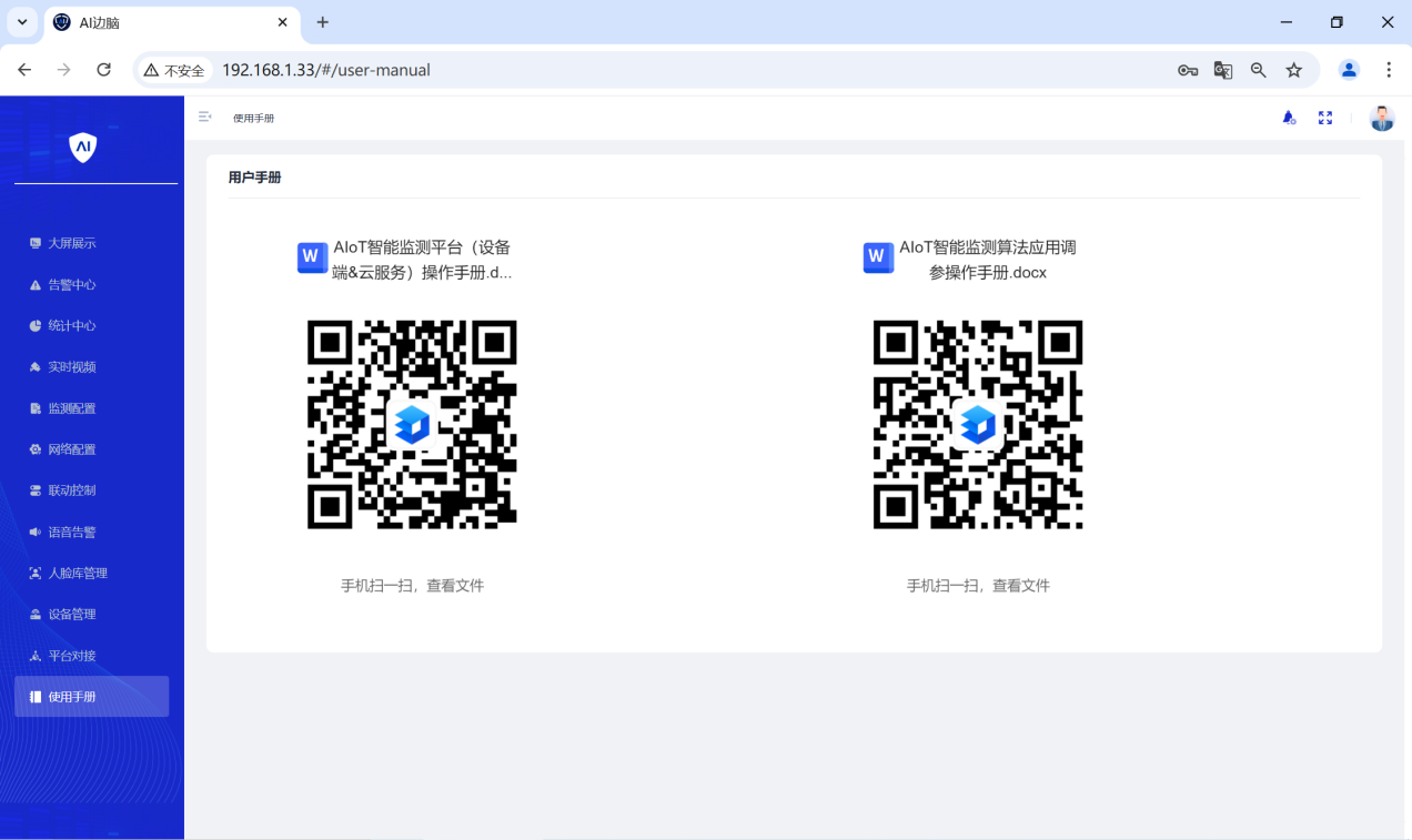 使用手册提供二维码共用户快速扫描获取使用说明,包括使用说明及算法调参说明。