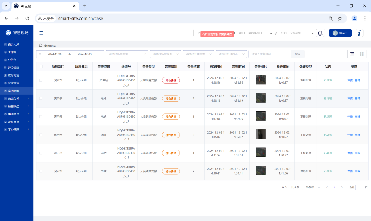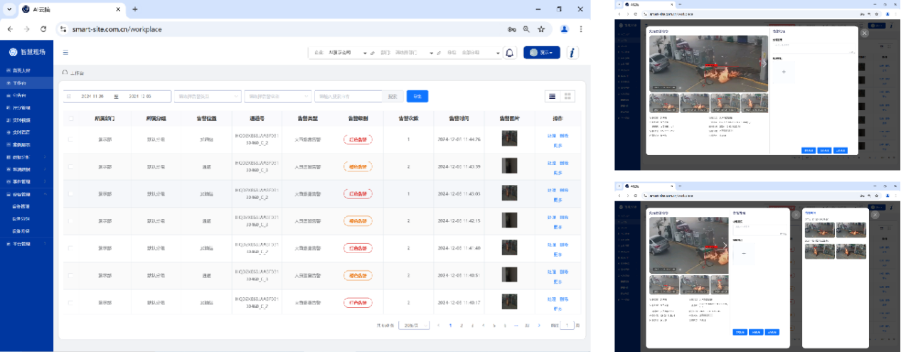 工作台提供所有告警数据的明细,提供告警位置、告警通道、告警类别、告警级别、告警时间、告警图片及告警处理状态等基础信息,并提供按时间维度、告警类型、告警级别及告警状态的查询;支持告警的单条处理及批量处理。