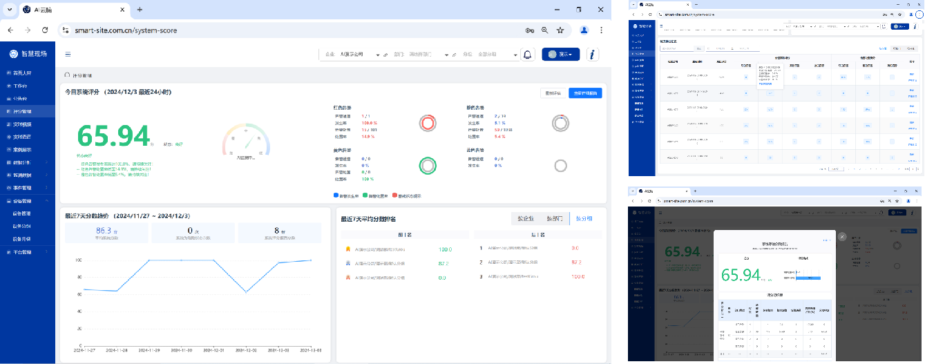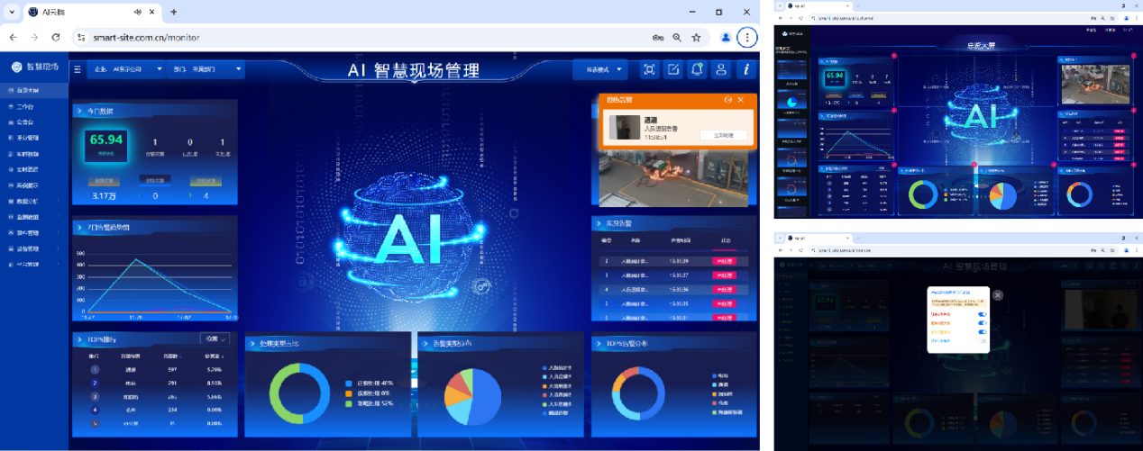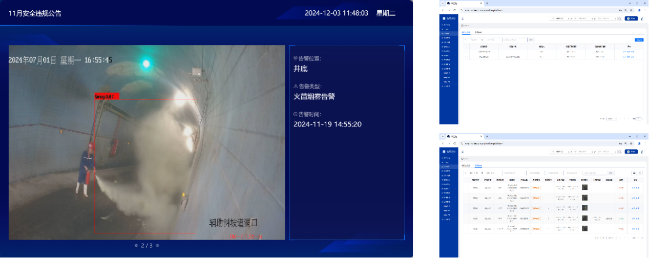 首页大屏展示当日告警数据,包括今日数据总览、按位置告警排行、告警级别占比、告警类型占比、告警趋势及实时告警。同时首页大屏支持大屏投放;并伴随实时语音告警提示。