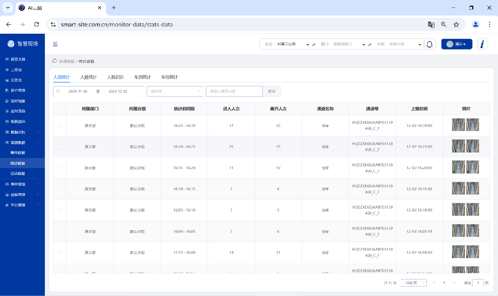 2、统计数据:对统计类的数据进行展示,包括人流统计,车流统计,人数统计,车位统计等;可按照部门,分组,通道,监测类型对数据进行筛选。