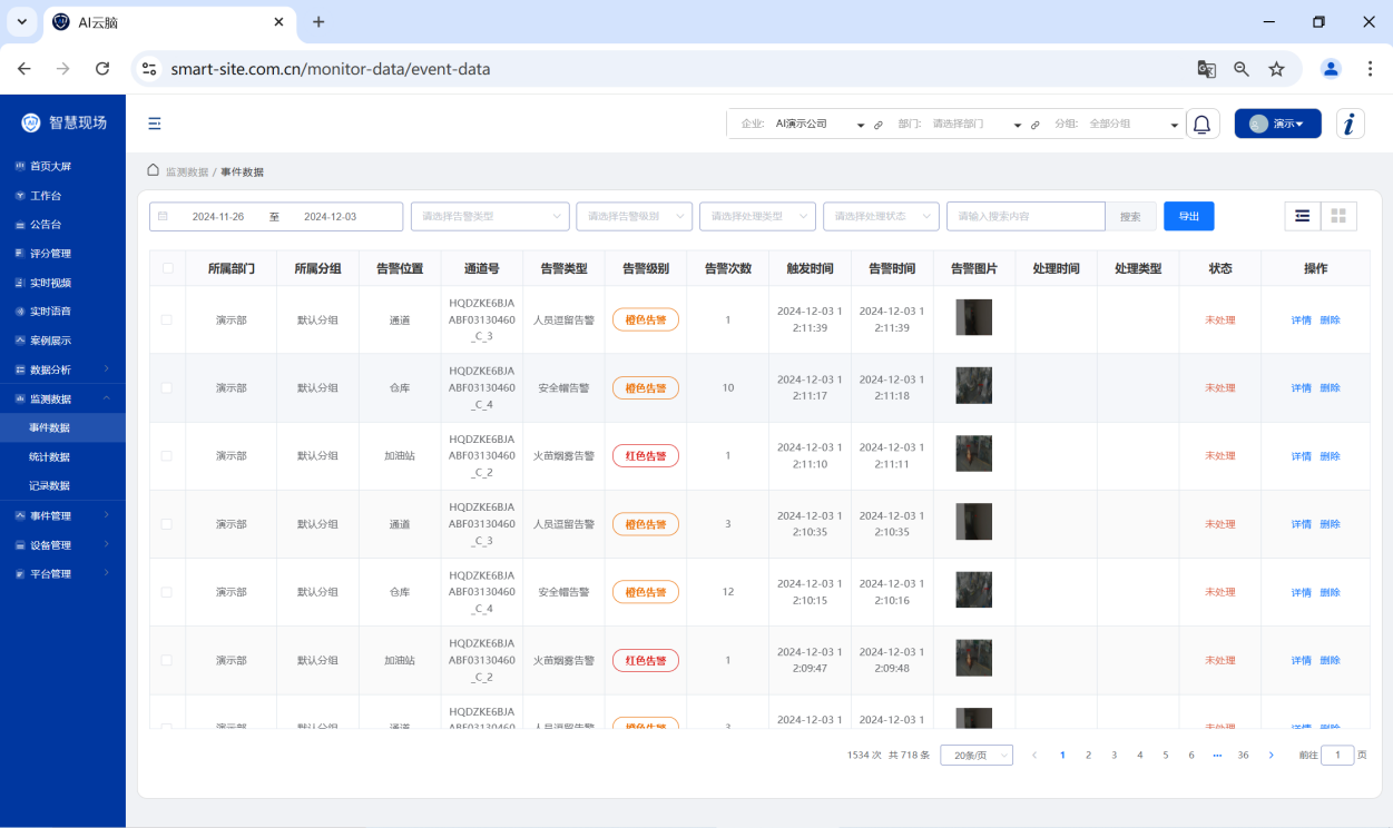 1、事件数据:对各类型的事件数据进行展示;可按照部门,分组,通道,监测类型对数据进行筛选;支持对已处理的事件数据进行展示、查询。