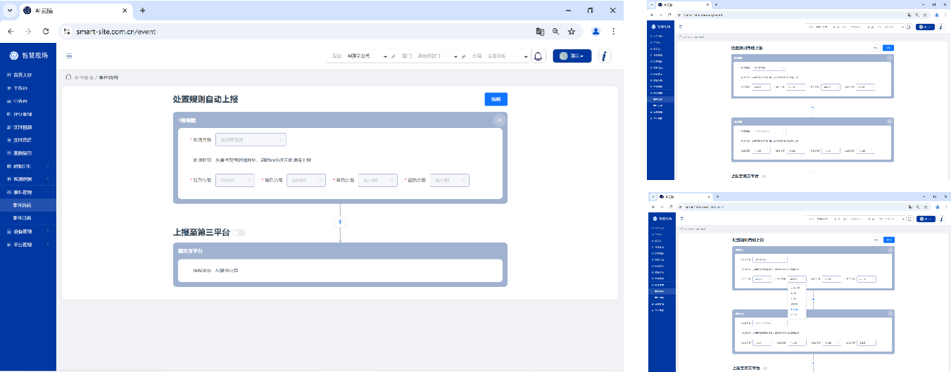 1、事件流转:支持事件的多级规则上报;支持事件按照处理角色、告警级别、处置时效进行分级上报;支持事件按规则上报到第三方平台;支持事件流转规则的自定义修改。